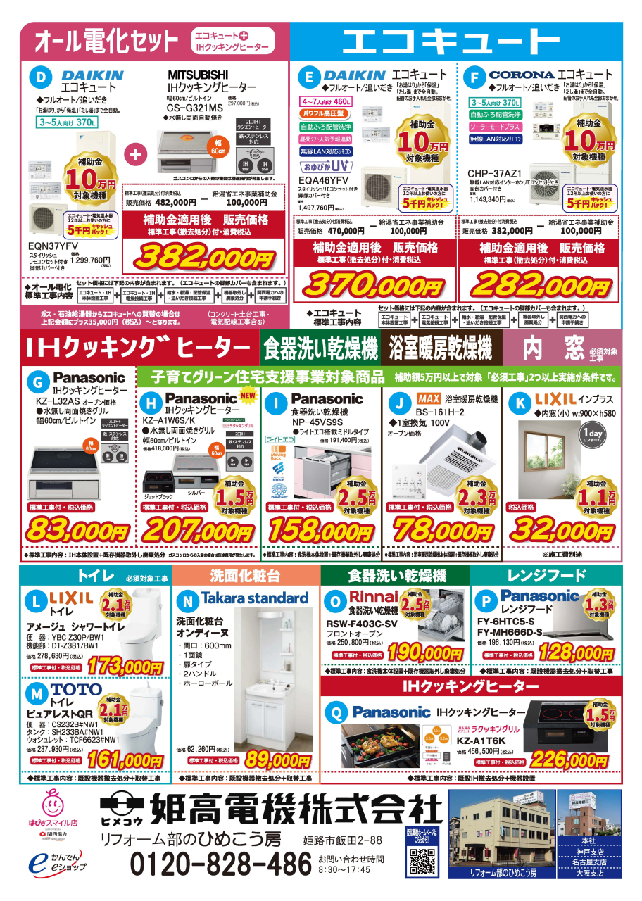エコキュートリモコンやIHクッキングヒーターのグリル部分や操作性も『見て・触って』体験できます。 各メーカー・機種の違いや、特徴・工事内容についてご不明な点や疑問点などを弊社スタッフがお答えいたしますのでお気軽にお立ち寄りください。 ショールームにお越しの際は、必ず下記フリーコールまでご予約をお願いいたします。
